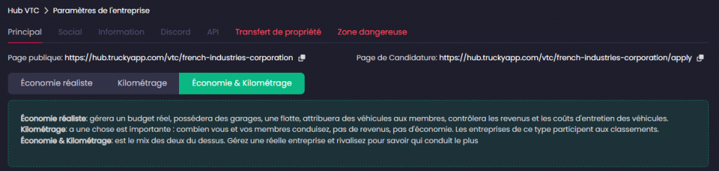 Vous pouvez changer le type d’entreprise à tout moment. Allez dans Trucky HUB > Paramètres de l’entreprise et sélectionnez le nouveau type :
